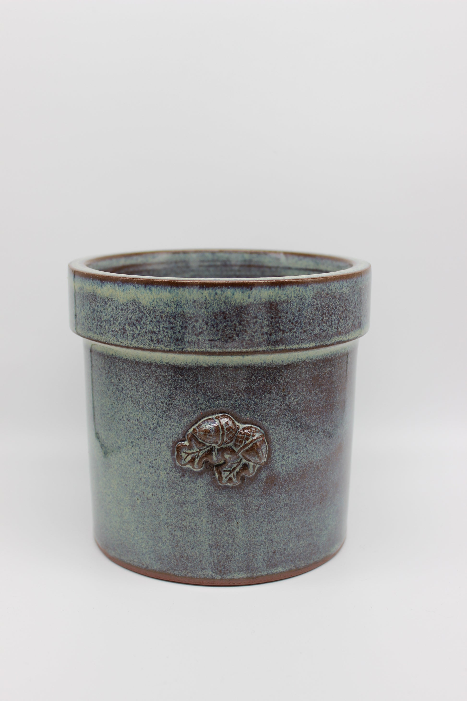 a beautiful piece for the kitchen, this spoon holder is 5.5" tall and 5.5" wide. a small acorn decal on each side and a rustic blue glaze