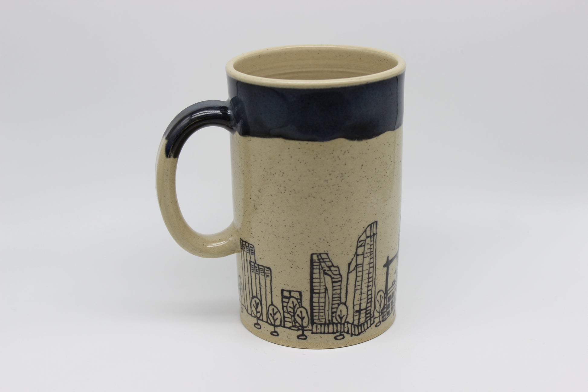 A tall hand painted mug featuring the City of Calgary. A band of blue clouds sits at the top, similar to the clouds of a chinook arch