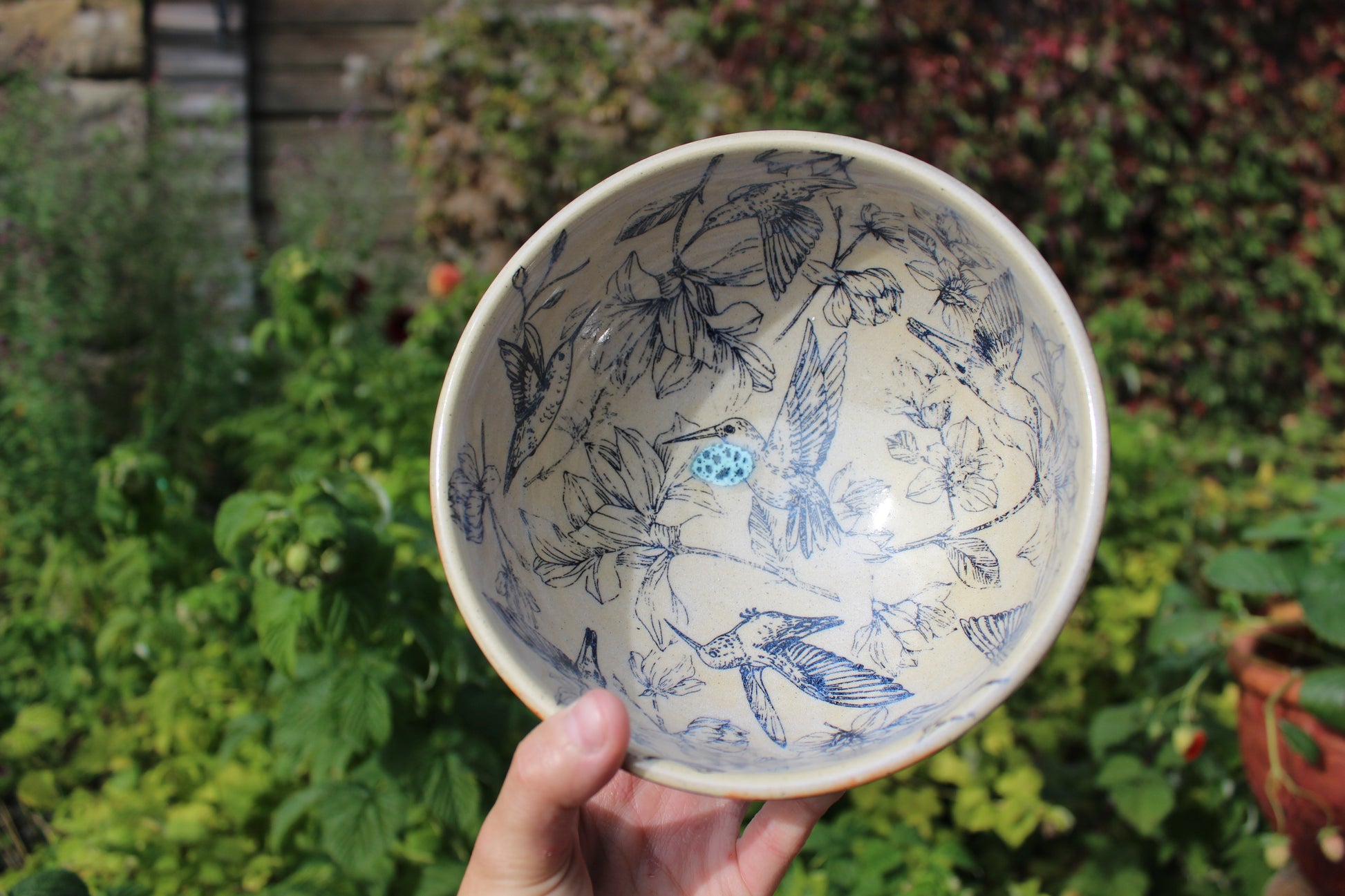 This hummingbird bowl is sized like a large cereal bowl. It has a glaze error with a blue spot in the middle